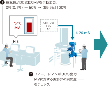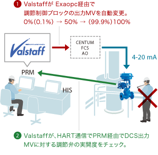 Valstaff代替操作员,经由Exaopc自动更改调节控制块的输出MV。利用HART通信,代替现场人员经由PRM检查调节阀相对于DCS输出MV的实际开度。